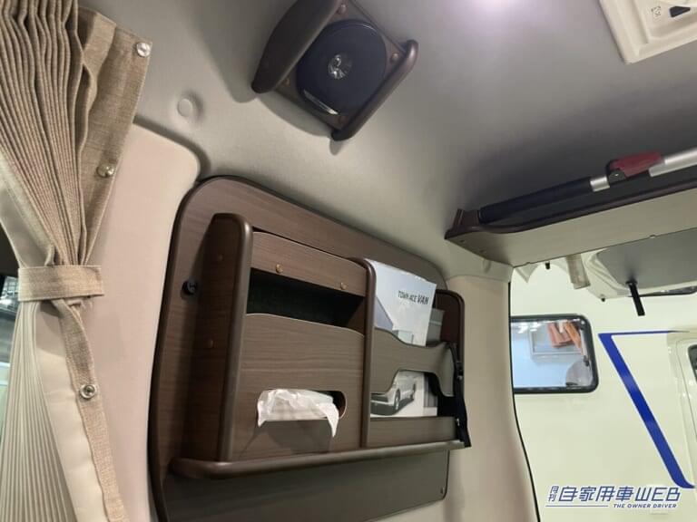 また、天井部分にファンが設けられているため、換気もしやすく快適な車内環境を維持できる。スピーカーとスイッチなどの電気系統も上部にまとまっており、荷物を積んだ際にも操作しやすい工夫がされている。