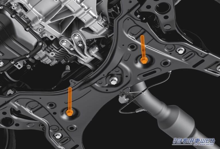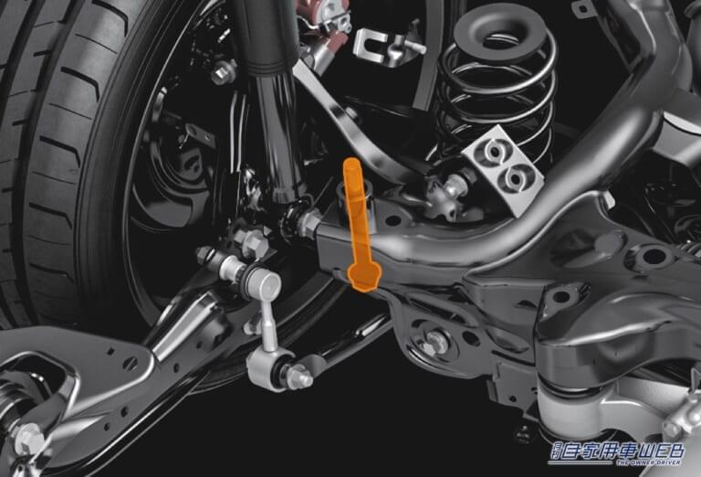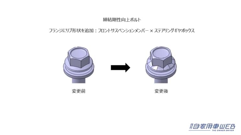 まず、シャシー部品を締結するボルトの一部に締結剛性向上ボルトを採用し、ステアリング操作に対する応答性と直進安定性を向上させ、クルマとの一体感を進化させている。フロントサスペンションメンバーとステアリングギヤボックスの接合のボルトにはフランジにリブ形状を追加。リヤサスペンションメンバーとボディの接合のボルトは頭部サイズが従来の22mmから24mmに拡幅された。