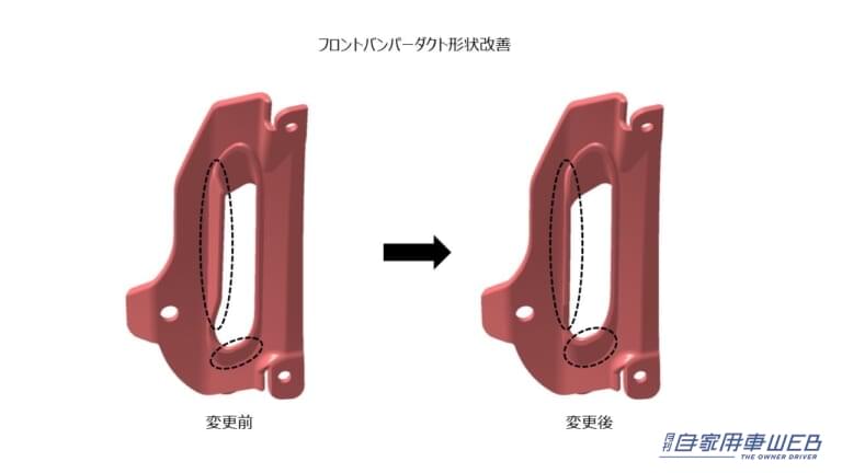 さらにスタビリティ向上のため、フロントバンパーのダクト形状を改善することでホイールハウス内の空気の流れを最適化し、操縦安定性を向上させている。