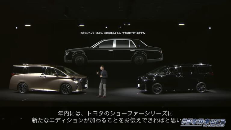 すでにトヨタは、2023年6月21日に発表したアルファード/ヴェルファイアのプレゼンテーションにおいて、登壇したトヨタ自動車株式会社 取締役・執行役員 デザイン領域統括部長のサイモン・ハンフリーズ氏が現行型「センチュリー」のサイドシルエットを明示しながら、「センチュリーさえも、大胆に変えようと、すでに動いているのです。」、「年内には、トヨタのショーファーシリーズに新たなエディションが加わることをお伝えできればと思います。」と語っている。会場の画面には、うっすらとSUV風のシルエットも映し出されていたのだ。