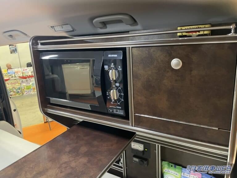 右側の棚には電子レンジとケトルを設置。スライド式で位置調整ができるテーブルで左右の棚が繋がる。