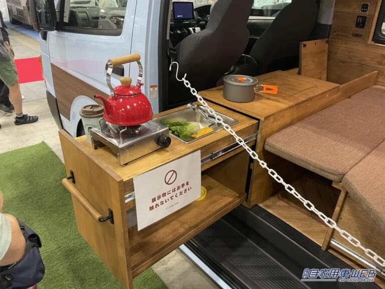 また、1列目のシートの後ろにはキッチンカウンターが設置されている。シンクを車内・車外のどちらでも使うことができる仕組みだ。