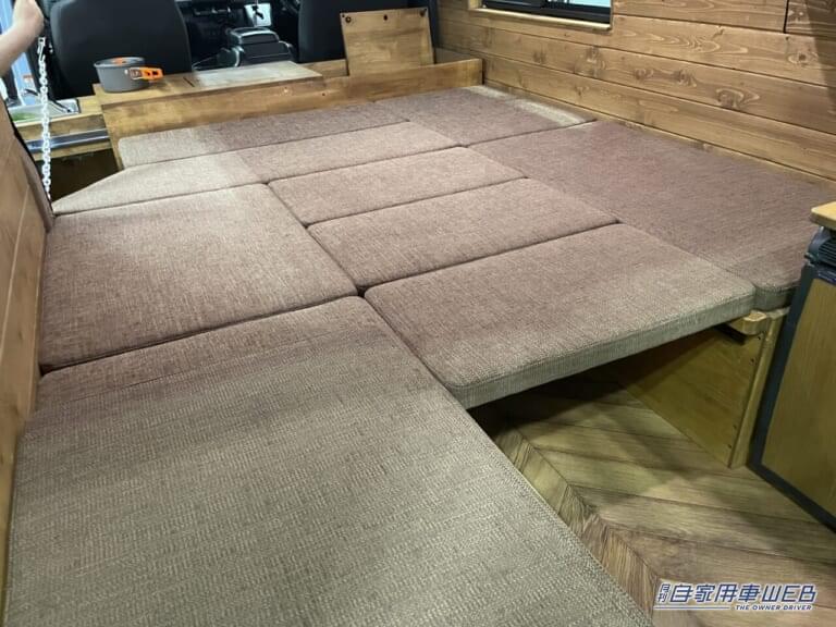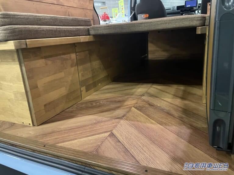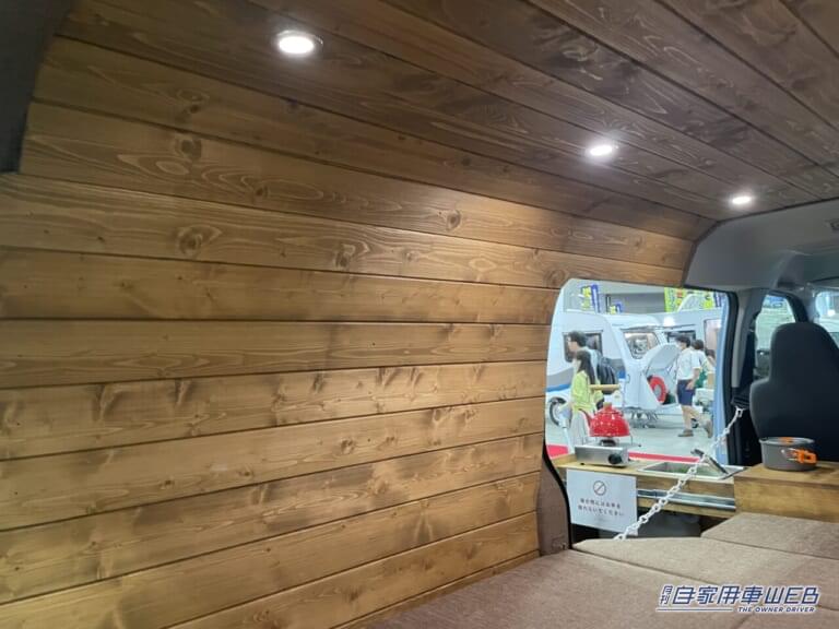 壁面から天井にかけて木材が貼らレテいることが、この車の大きな個性となっている。ログハウスやサウナのような雰囲気だ。