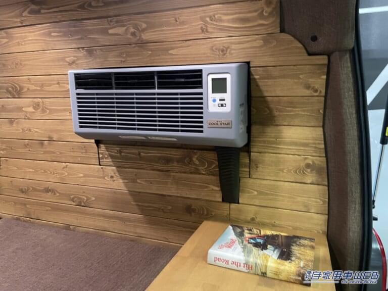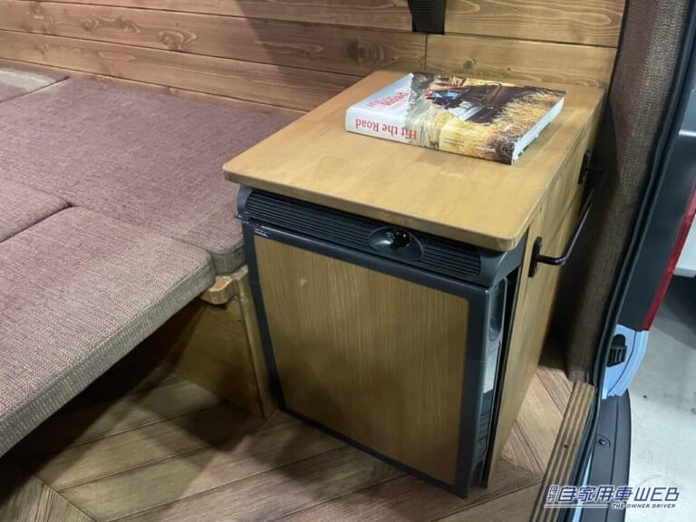 エアコンは壁面に、冷蔵庫は荷室の後方に配置。冷蔵庫の上面は木材を使ったフラットなスペースとなっているので、机として活用できる。