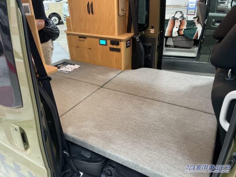車内はフルフラットになっており、大人2名が横になれるスペースを確保。軽自動車とは思えない広さだ。