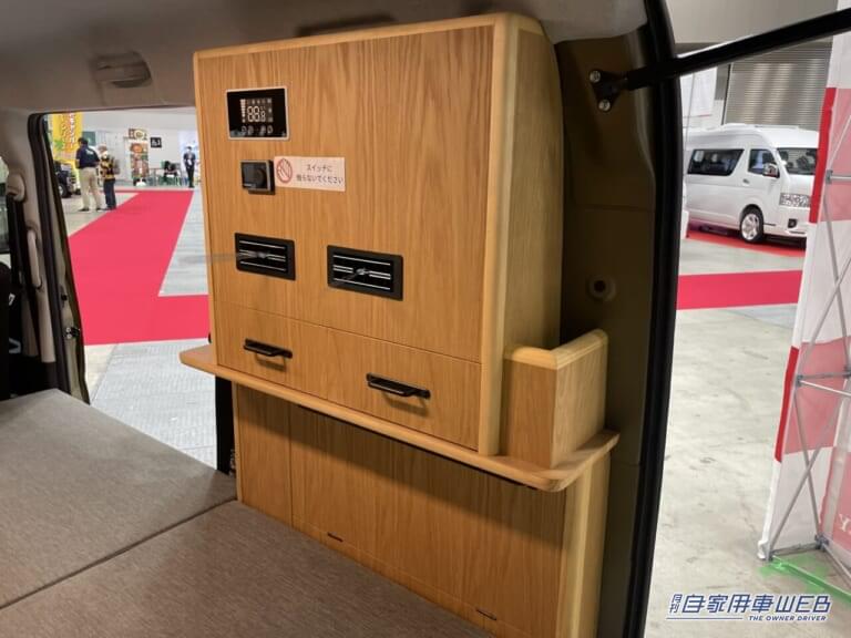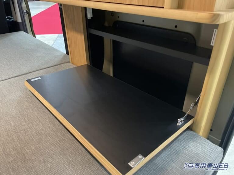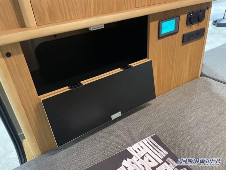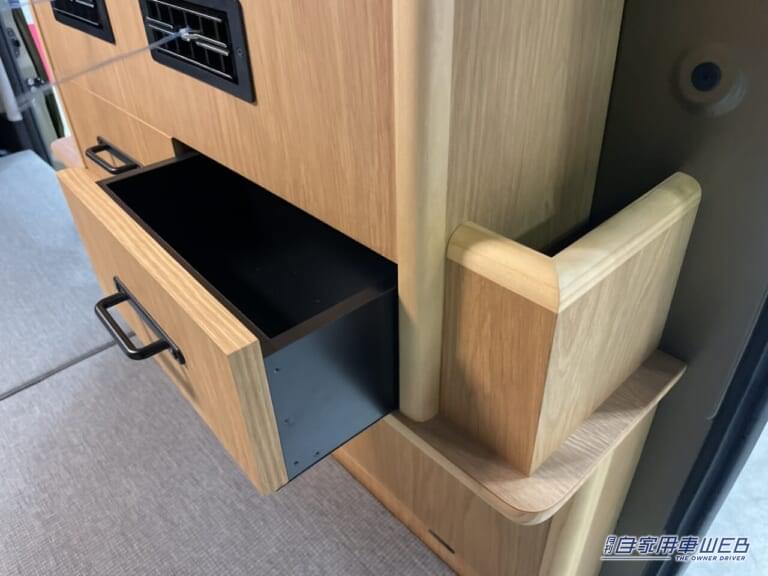 車内右側にはエアコンを内蔵した棚が設置されている。エアコン部分の下には複数の収納スペースが。引き出しは小物を入れておくのにはとても便利で使いやすい。