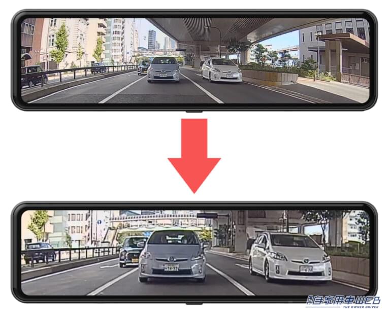 従来のデジタルルームミラーでは実際の車間距離とデジタルミラーでの車間距離が異なる事があったが、搭載されているズーム(拡大/縮小)機能では最大15段階の設定が可能、違和感の無い車間距離に設定することができる。
