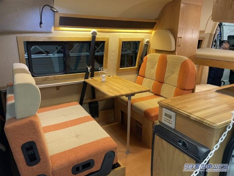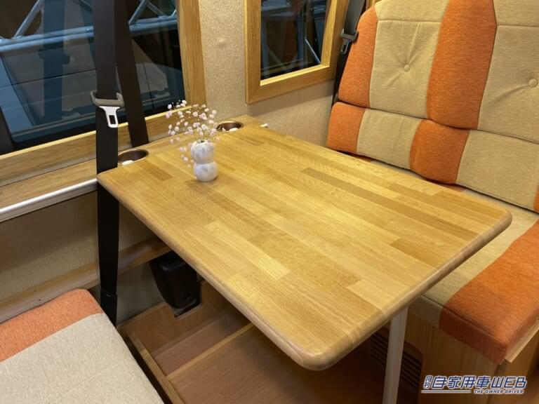 白とオレンジのシートが非常に印象的。木材の質感を活かしたテーブルも車内の雰囲気にあたたかみを加えている。