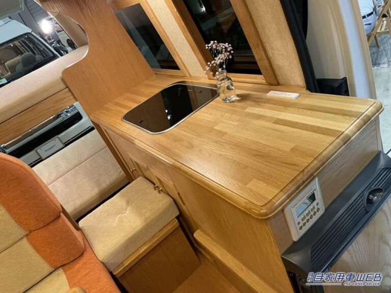 スライドドアから入って右にはキッチンカウンターが設置されている。シンクと作業スペースは十分な広さを確保。側面には冷蔵庫が埋め込まれている。