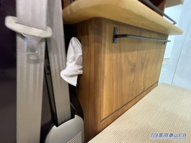 右側には小物などの収納に便利な棚が設置されている。下の棚はティッシュケースも備えている。定位置を決めることができるので、何気に便利な装備と言える。