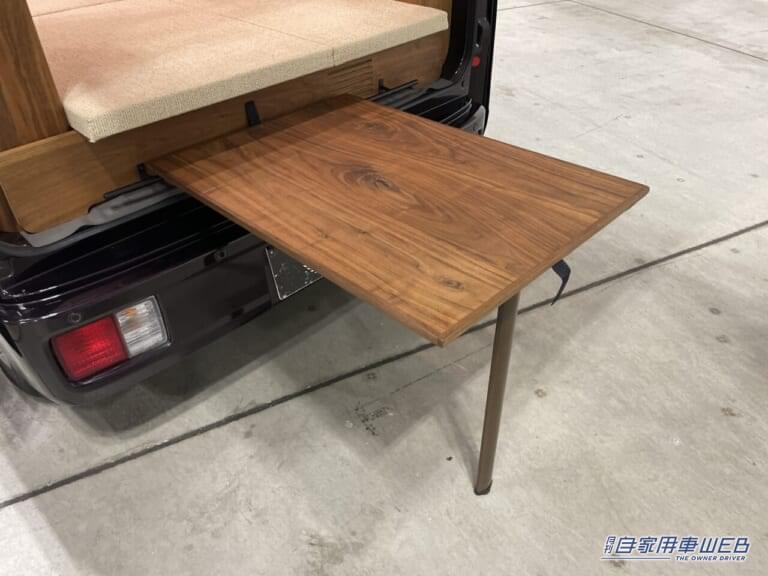 折りたたみ式のテーブルは、車外にも設置できる仕様。デイキャンプや車中泊の際の食事時などに活躍してくれる。