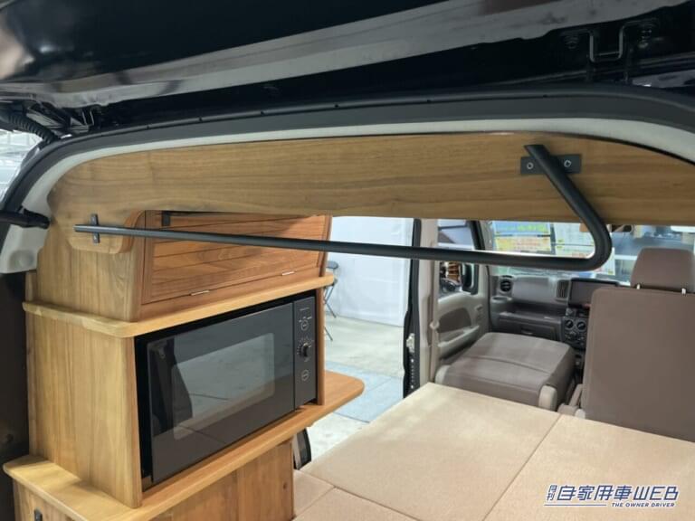 後方左側には電子レンジを備えた棚が設置されている。シュラフなどの軽いものを入れておくには便利な収納スペースとなっている。