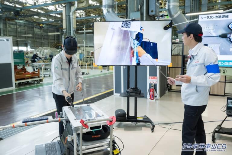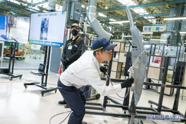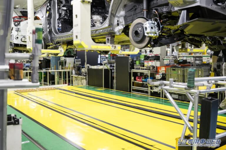 さらに組立ラインの床面が黄色と緑色に塗り分けられているのにも注目だ。これは車両を吊り下げるハンガーに接触し、作業員に怪我をさせないように危険が視覚的にわかる黄色に塗ったが、他の場所と比べて70ルクス明るくなるという副産物も手に入れたという。クルマの床下から作業する場合、ブラックなどダーク系のボディカラーのクルマでは細かい作業がしにくいというのがあり、過去は蛍光灯を床に付けたりヘルメットにライトを付けて作業していたが、かえって見えにくいということがあったという。しかし、黄色塗装することで安全と作業のし易さの両立ができたのだ。これもカイゼンから生まれた作業効率の進化だ。