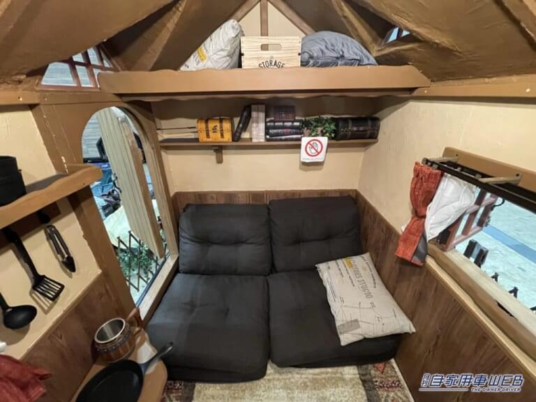 室内にはソファが設置されており、広げれば子供が就寝可能なサイズのベッドとしても使うことができる。その上部には棚とロフト的な収納スペースも設けられている。