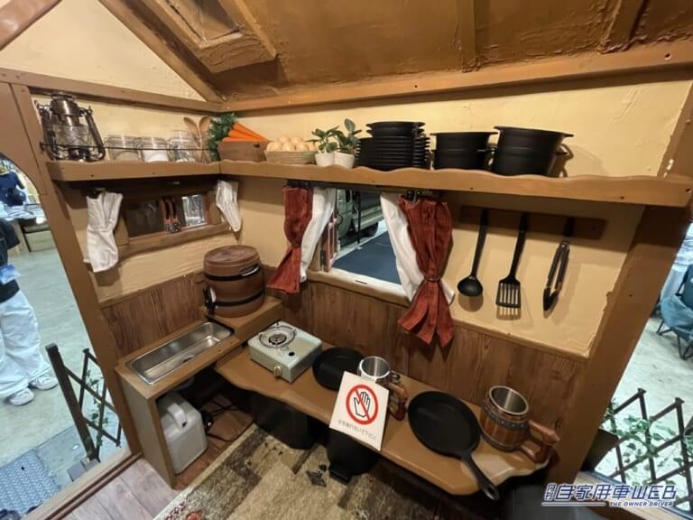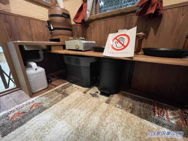 樽を模した大型のジャグから水を供給する。鍋などの大型の調理器具は上部の棚に置かれている。ポータブル電源はサイドのテーブルの下に設置すれば邪魔にならず違和感もない。