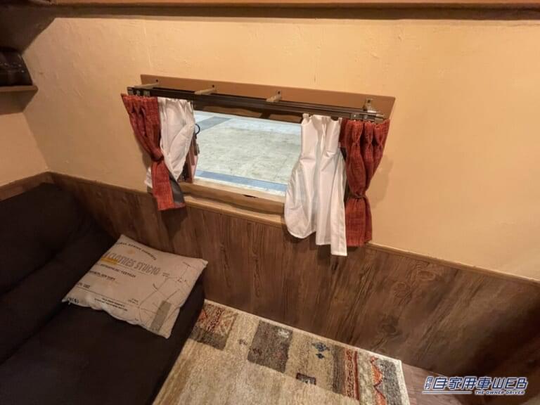 窓にもきちんとカーテンが設置されており、本物の家のよう。三角形のロフト部分の端ににはクッションやシュラフなどを、中央部分にはストレージなどを、高さに応じたものを収納すれば、スペースを無駄なく使うことができる。
