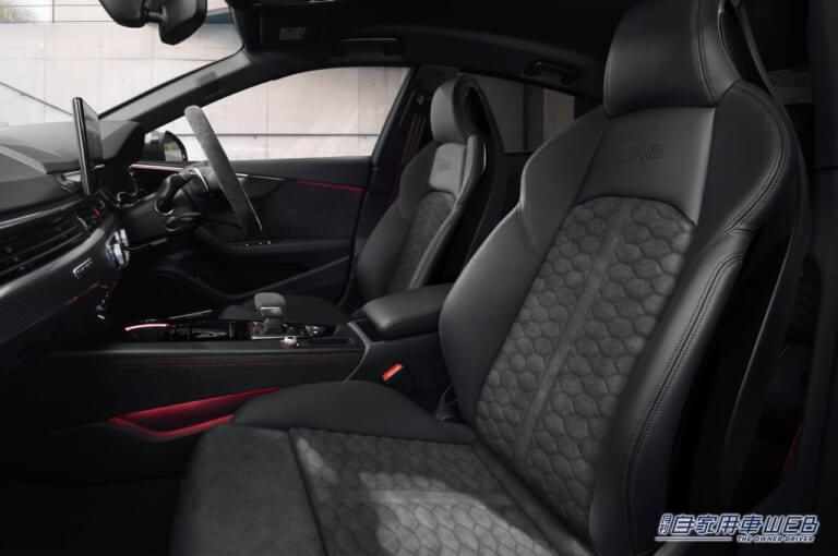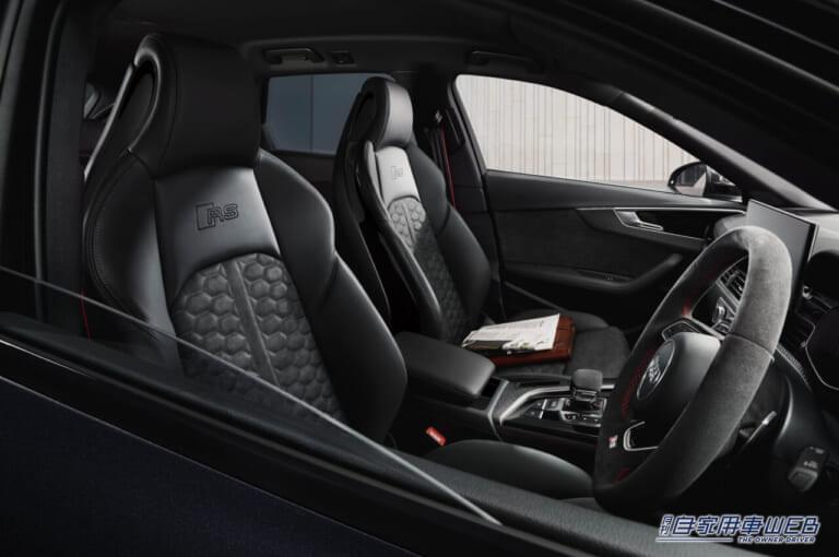 内外装は、ブラックメタリックの20インチAudi Sport製5Yスポークアルミホイールに、ハイパフォーマンスタイヤのPirelli P Zero Corsa 275/30 ZR20を特別装備。さらにパフォーマンス専用チューニングとして、RSスポーツエグゾーストシステムプラス、290kmに設定したスピードリミッター、変速時間を短縮する専用シフトプログラム、1:13.1の固定ギヤ比に設定したダイナミックステアリング、旋回性能を向上させて高速でのアグレッシブなコーナリングをサポートする専用設計のリヤスポーツディファレンシャルが含まれる。「RS4 Avant RS competition」の0-100km/h加速性能は3.9秒、「RS5 Sportback RS competition」は3.8秒を達成している。