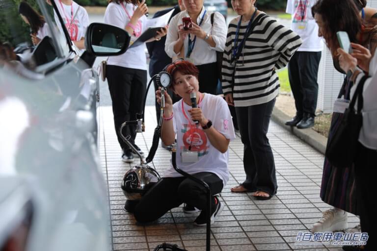 エアゲージに触ったことがない、愛車のタイヤをよく見たことがない、車庫入れの時に最初にどこに停めたらいいかわからない、という参加者も多くて、みんな真剣そのもの。何人かの参加者には実際にやってみてもらい、「これなら次からできそう!」と笑顔になってくれました。