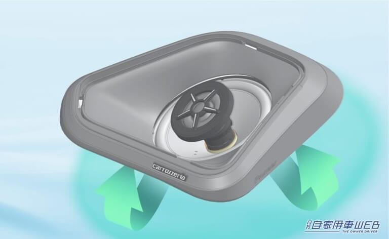 「クロスアキシャル機構」と「スラント機構スペーサー」により、フロントガラスへの反射を低減し、直接伝わる音が増えることによりクリアで実体感のある音を実現。さらに「フレア形状グリルフレーム」により、音の回り込みを防ぎ、豊かな中低域再生と、よりクリアな高域再生を可能としている。