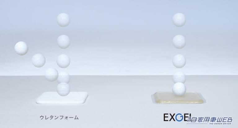 「エクスジェル」は、手でつかむとおもちのように伸びる柔軟性のあるジェル素材。ただ柔らかいだけではなく弾力性にも優れ、身体を安定して支持。低反発でも、高反発でもない、全く新しい素材「エクスジェル」は、ゴルフボールを落としてもほぼ跳ね返りなく衝撃を吸収。