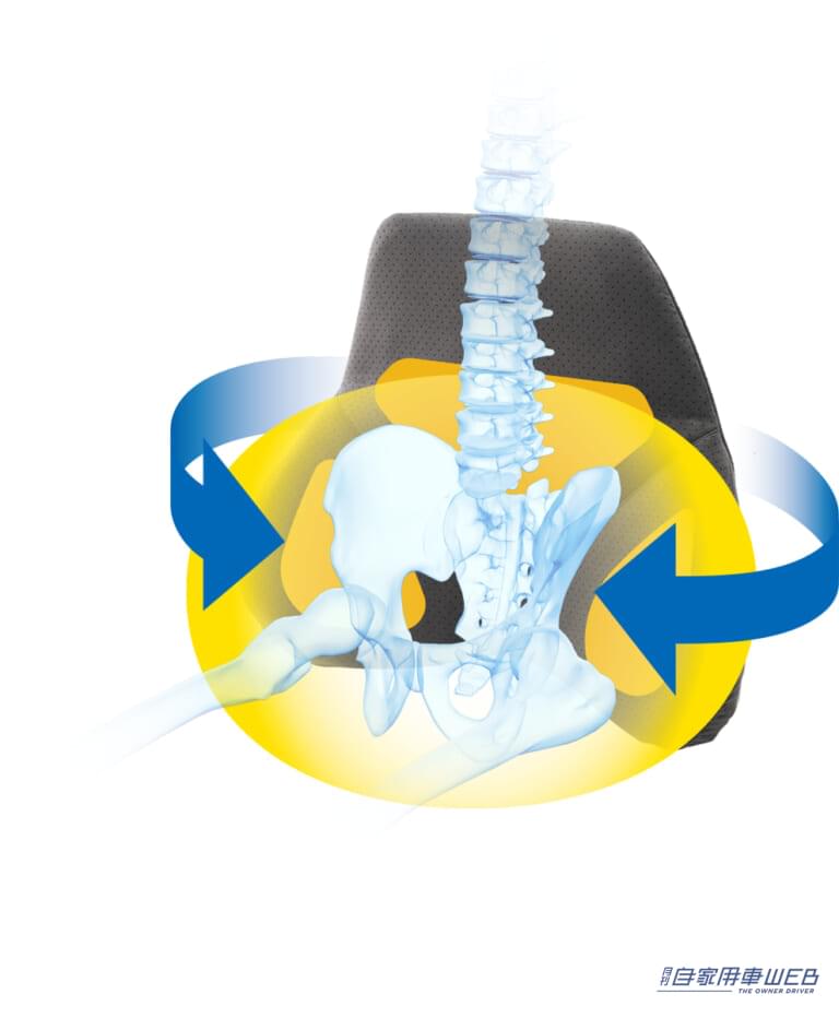 ・深くもたれかかる力を利用して骨盤全体を左右から包み込む骨盤サポート設計。
