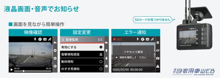 ・画面と音声でエラーをお知らせ。microSDカードの速度低下やエラー、ケーブル等の接続不具合などをカメラが検知すると、画面と音声で通知