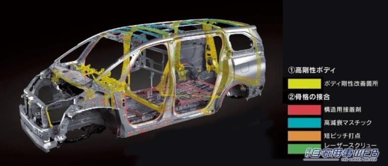 剛性確保が難しいMPVのボディ骨格を強化するためにリヤ床下ブレースを採用。さらにレーザースクリューウェルディング(LSW)や構造用接着剤、ハイテン材やアルミ材などを適材適所に使用することで、先代比でボディ重量を増やすことなく、1.5倍のねじれ剛性を確保している。