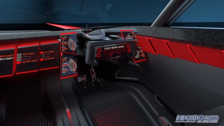 Rモードでは赤いライティングで彩られたインストルメントパネル全体がドライバーに向かってせり出し、直感的な操作がしやすいコックピットに変化。GTモードでは、インストルメントパネルのライティングが青色へと変化し、Rモードで4分割されていたステアリング周りの画面が統合され、エアコンやオーディオに加え、サスペンションやスタビライザーのセッティングなど、グランドツーリングに最適な情報を表示される。また、AR(拡張現実)とVR(仮想現実)を体験できる専用のヘルメットを装着することで、リアルとバーチャルのどちらの世界でも走りを楽しむことも可能だ。