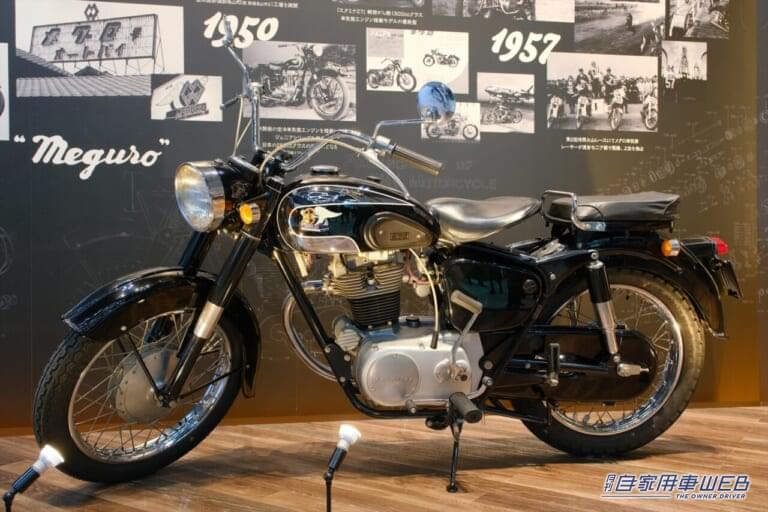 バイク乗りとして見逃せなかったのがカワサキのブースでした。かつて存在した二輪メーカー「目黒製作所」がカワサキ(当時は川崎航空機工業)に吸収され、生産していたというバイクがメグロです。