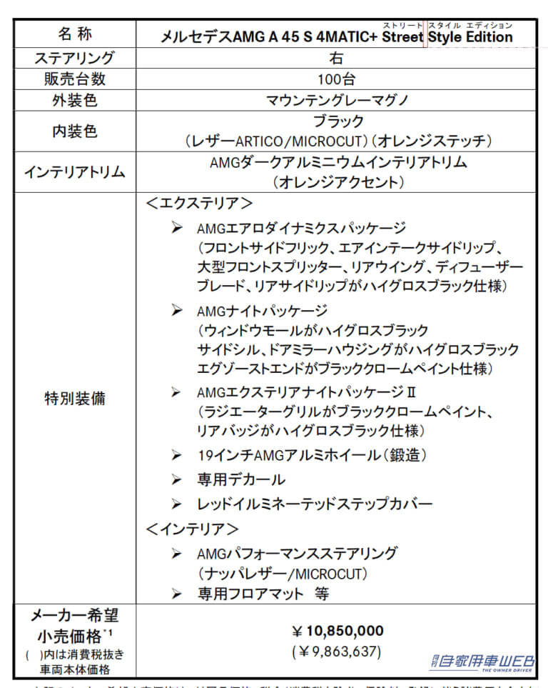 メルセデスAMG A 45 S 4MATIC+ Street Style Edition 価格は1085万円(限定100台)