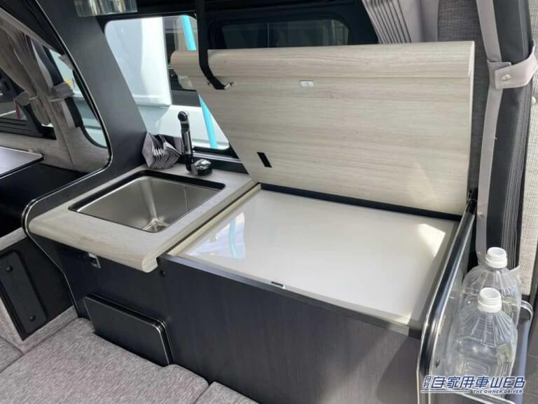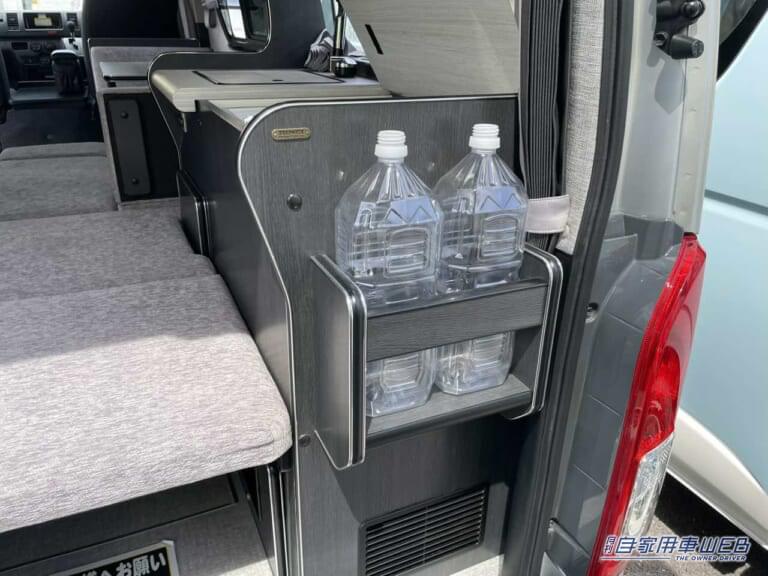 カウンターにはシンクと冷蔵庫が埋め込まれている。2Lペットボトル2本が入るホルダーは、アウトドアユースの際には非常に便利だ。