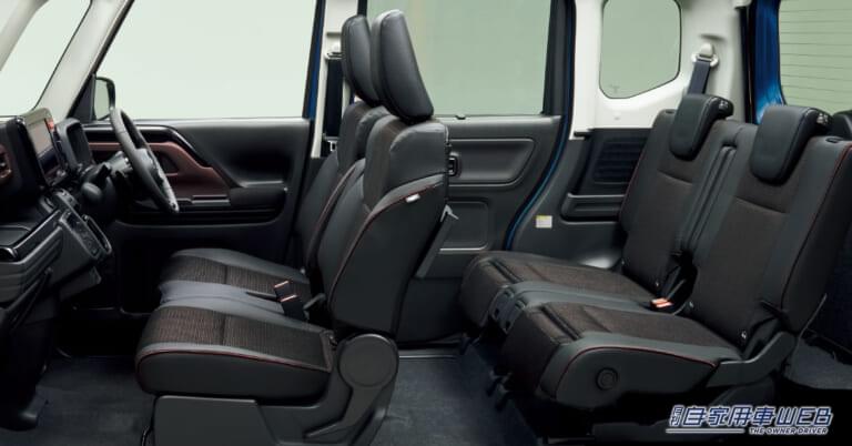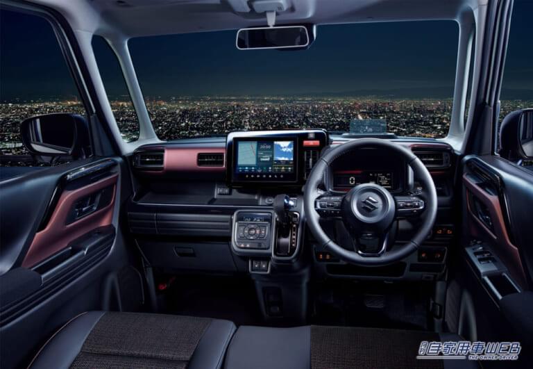 画像はスペーシアカスタム HYBRID XS。ブラックを基調色にボルドー&ブラック加飾を組み合わることで上質かつ落ち着いた雰囲気を演出。シート表皮はスウェード調起毛で華やかさもプラスしている。