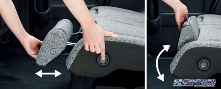 ・リヤシートにマルチユースフラップをスズキ車として初採用。フラップの位置や角度を調整することで、くつろぎ感を得られるオットマンモード、走行中の姿勢安定をサポートするレッグサポートモード、荷物の落下防止をサポートする荷物ストッパーモードの3つのモードを選ぶことが可能。