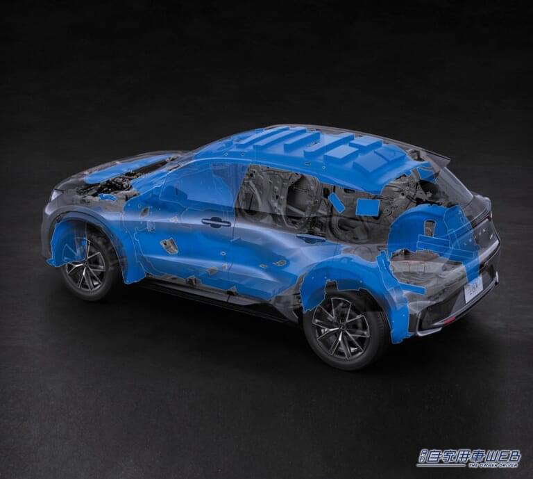 コンパクトカー向けTNGAプラットフォーム(GA-B)をベースに、レクサスならではの贅沢な設計思想を注入。ボディ骨格の接合には短ピッチ打点技術や、構造用接着剤の採用部位を拡大することで、NV性能を高める工夫も注がれている。