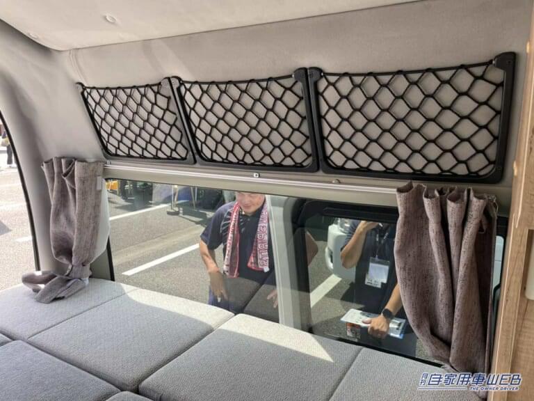 フラットシートは広く、荷物の積載はもちろん車中泊の際のベッドとしても十分に機能する。窓にはカーテン、その上にはネット状の小物入れが備わっている。