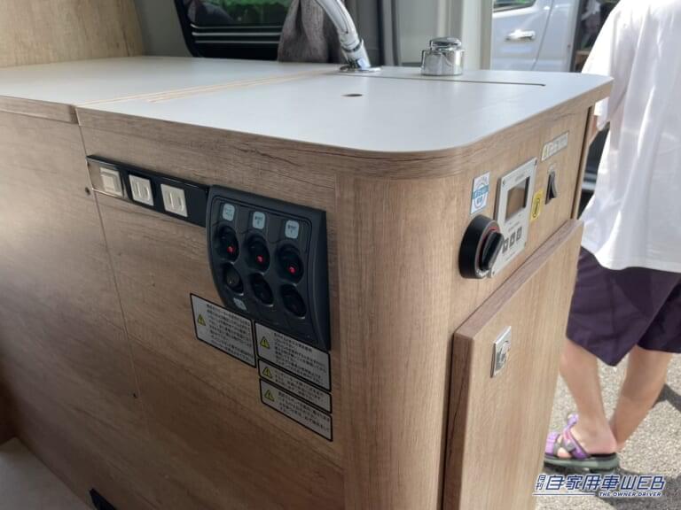 車内左側にはキッチンカウンターが。シンクと冷蔵庫が埋め込まれており、電気系統のコントロールパネルもこちらに配置されている。