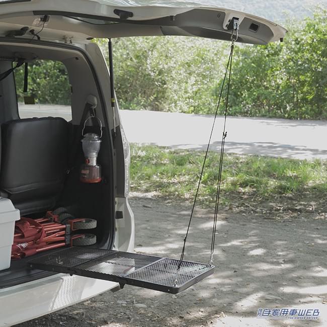 『HANGER TABLE』は、トランクドアから吊り下げるタイプのテーブル。脚がないため、ぬかるんだ地面や、デコボコな地面でも気にすることなく展開可能だ。