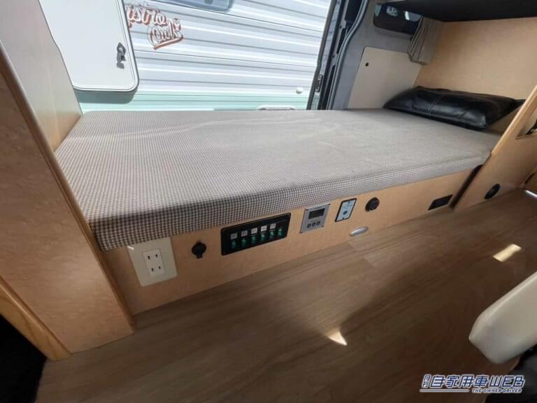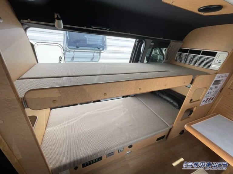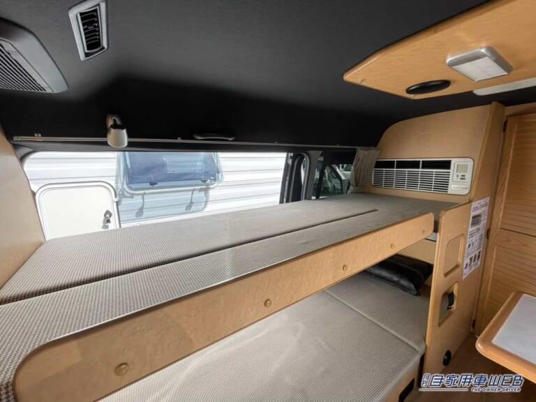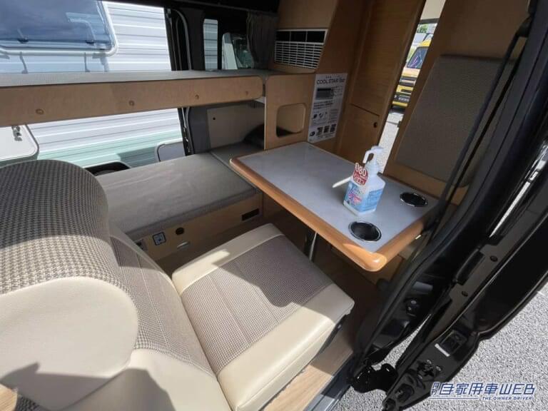 車内はボックス席と二段ベッドが配置された居住エリアと、電子レンジ・冷蔵庫・シンクが設置されているキッチンスペースが仕切られたレイアウトとなっている。
