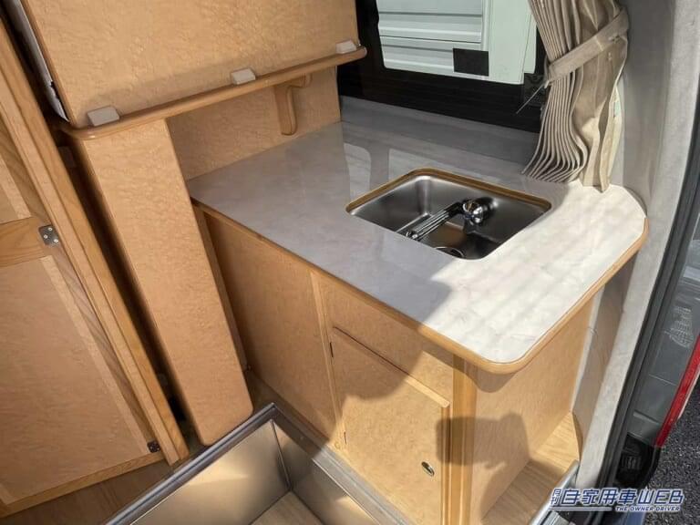 バックドア側はキッチンスペースとなっている。居住エリアとはドアで仕切られているので、調理の際のにおいなどが車内に充満してしまう心配はない。