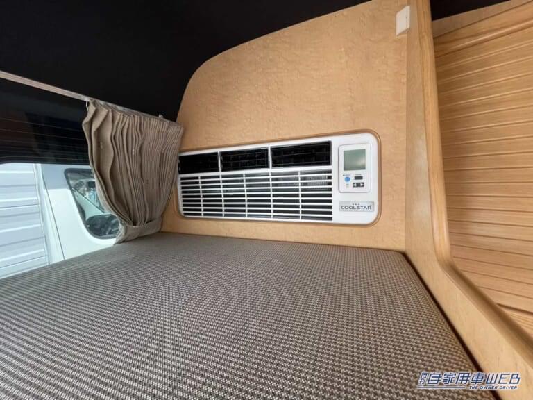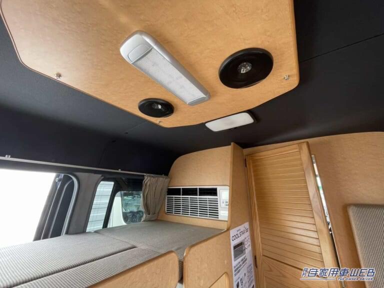 天井には照明とスピーカーを装備。エアコンは二段ベッドの上段部分に設置されている。