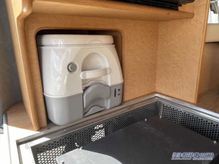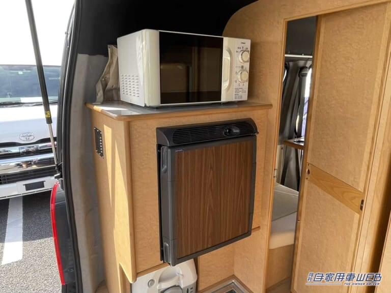 左側には電子レンジと冷蔵庫が。その下には簡易トイレを収納しておくことも可能なスペースがある。