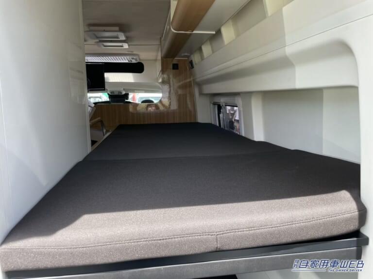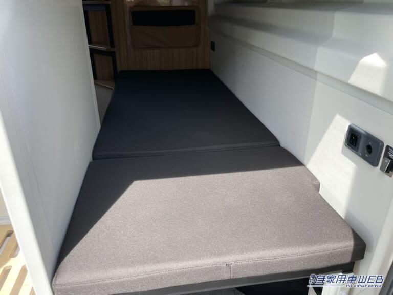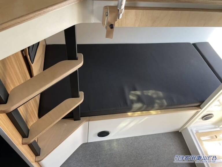 車内後部右側は二段ベッドとなっている。上下段どちらも大人1名が寝るには十分なスペースだ。