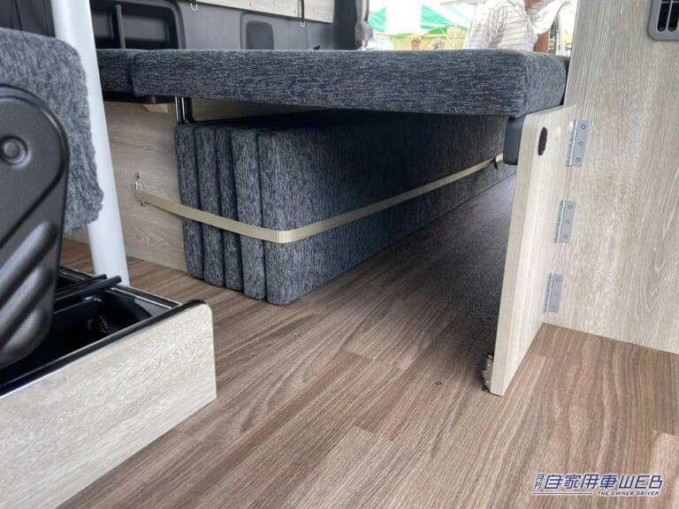 スライドドア側のフロアは少し広めに作られている。ステップ部分の半分くらいを広くしただけだが、ここがあるのとないのでは使いやすさが段違いだ。フラットシートの下には長めの荷物を収納できるスペースが。