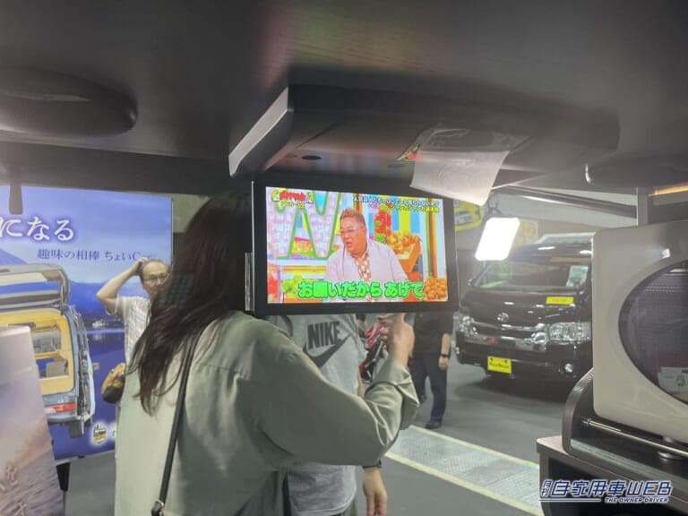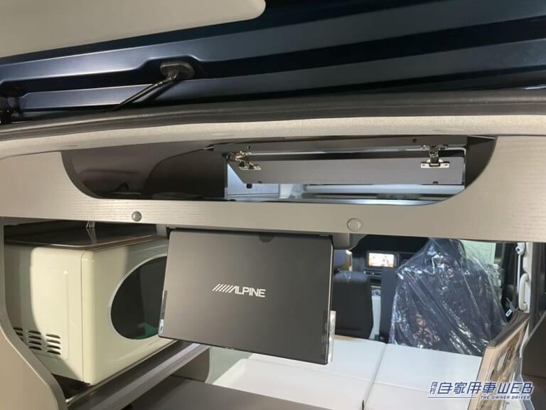 フリップダウンモニターは後方に位置している。またその上部には収納スペースも設置されている。シュラフなどを入れておくには最適。