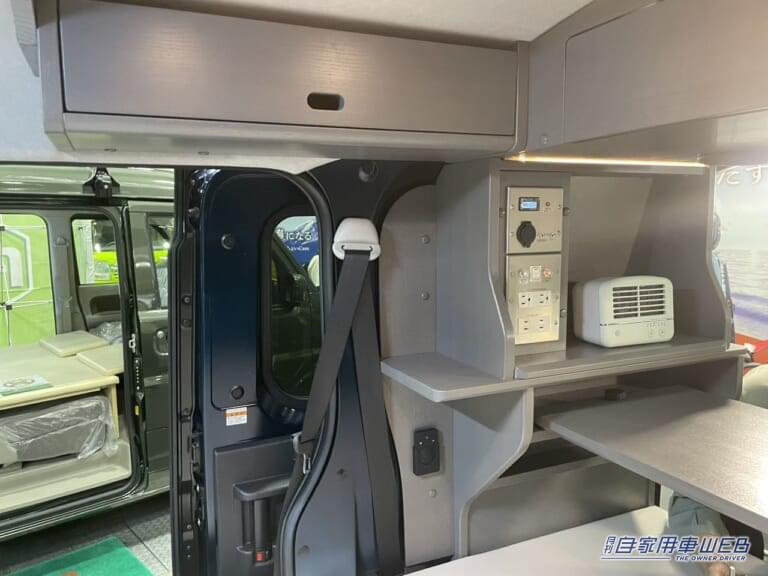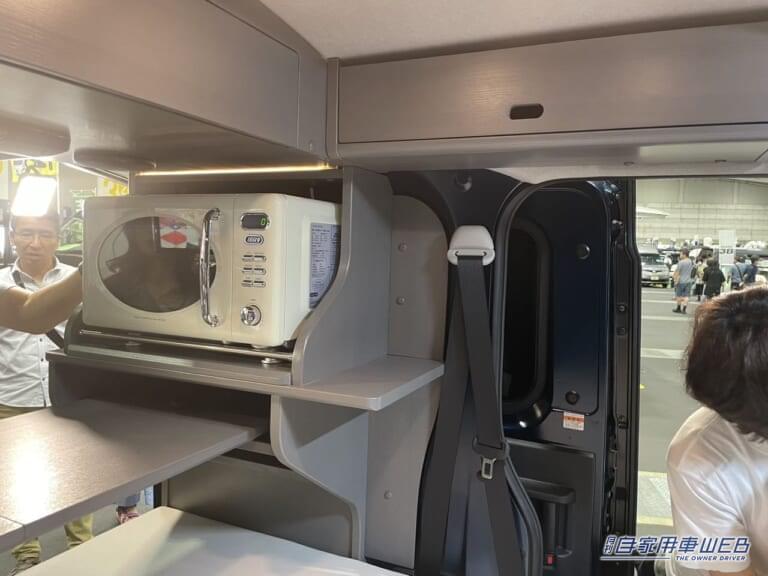 荷室の右側にはコントロールパネルが設置された棚が位置している。右左の棚を繋ぐように掛けられたテーブルは用途に応じて取り外し可能。左の棚には電子レンジが設置されている。