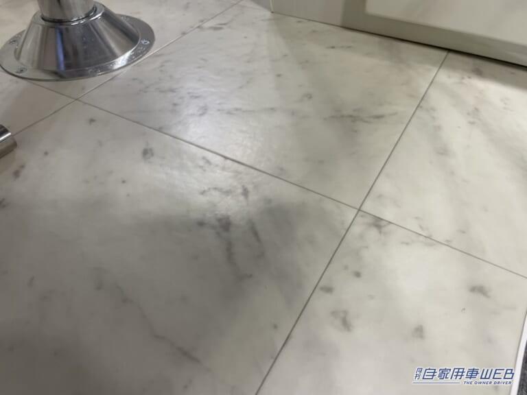 フロアは水や汚れに強い素材となっている。白いマーブル柄なので、ホワイトを基調とした車内に馴染みながらも汚れが気にならない。