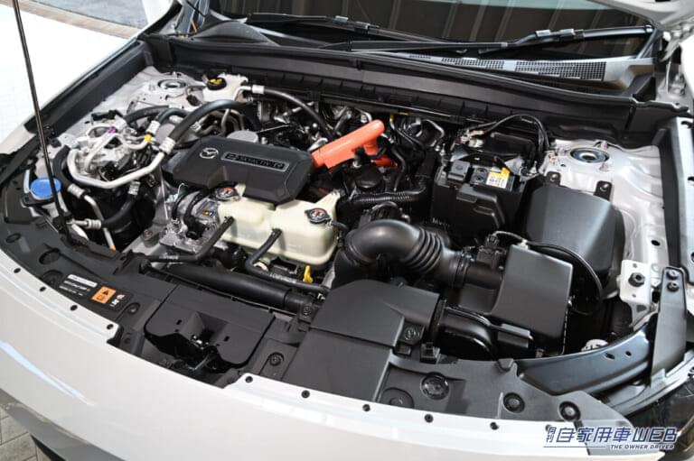 搭載されるロータリーエンジンは新開発の8C型。1ローター830ccの軽量小型タイプで、大負荷(高回転)を効率的に使うことで発電時間を短縮する制御が組み合わされる。WLTC総合モード燃費は、MX-30のマイルドハイブリッド仕様に僅かに及ばない15.4km/L。一充電走行距離は107kmが確保されるなど、BEV的な使い方も可能だ。