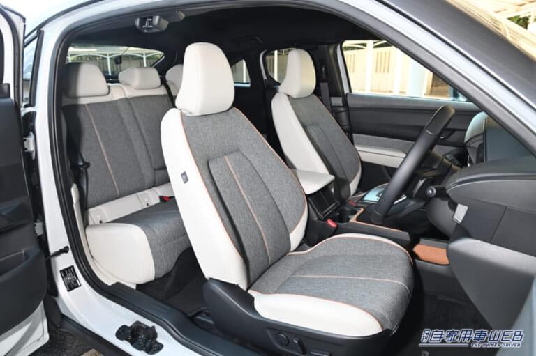 駆動モーターの制御特性も穏やか系で、急アクセルでも瞬発力は控えめ。実際の走りも、滑らかに加速していく印象が強い。パワフルさを売りにするモデルが多い純電動車にしては、派手なドライバビリティの変化は少なく制御されており、速度変化による刺激や昂揚感よりもドライバーのストレスを低減させるような、操り心地の良さを重視した味付けだ。なおフットワークは、路面からの突き上げ感は少し気になるが、マツダ3系統のプラットフォームモデルの中では、乗り心地のバランスが取れており、最も穏やか。