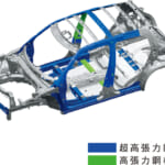 軽量で強度の高い高張力鋼板の使用範囲の拡大し、さらに構造用接着剤を採用することで軽くて剛性の高いボディーを実現。スタビライザーの仕様を変更することで、コーナリング時の車体の傾きを抑え、操縦安定性を向上させている。