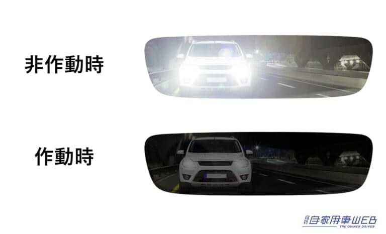 「自動防眩機能付きインナーミラー」の作動時と非作動時の比較